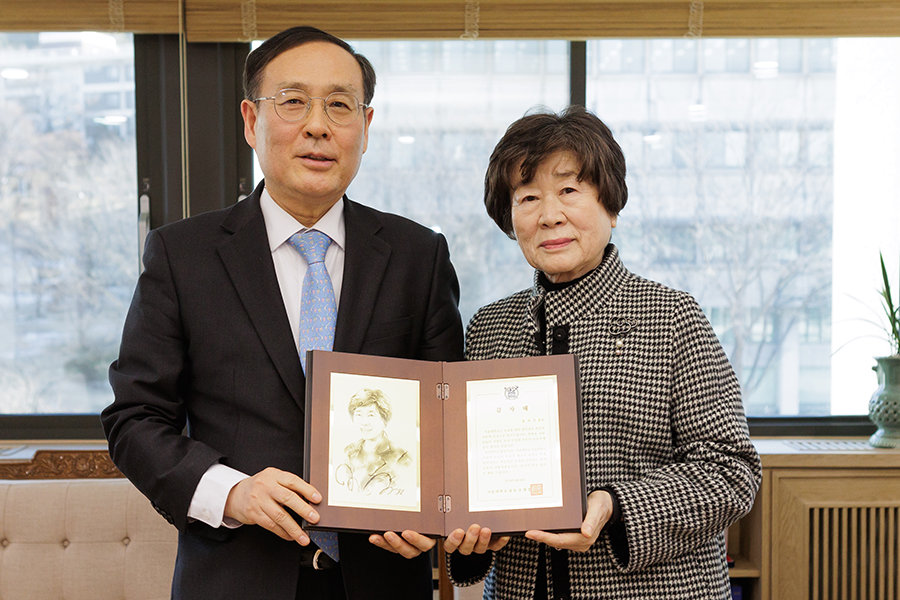 ※ 사진설명: 오세정 총장과 윤옥진 동문이 기념촬영을 하고 있다.