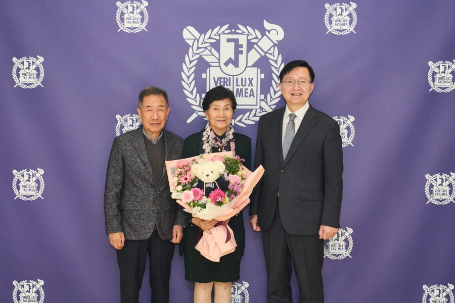 사진설명 : 유홍림 총장(오른쪽)과 이도영 CM병원 이사장, 이윤경 CM병원 대표 부부가 기념 촬영을 하고 있다.