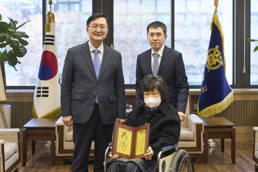 사진설명 : 유홍림 서울대 총장과 주경숙 동문, 아들 박진재 변호사가 1월 28일(수) 감사패 증정식에서 기념 촬영을 하고 있다.