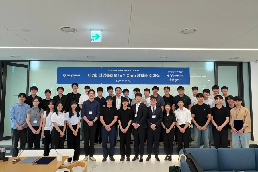 ‘제7회 타임폴리오 IVY Club 장학금 수여식’에서 IVY Club 7기 투자 동아리 회장단과 함께 기념 촬영을 하고 있다. / 사진 제공 = 타임폴리오자산운용