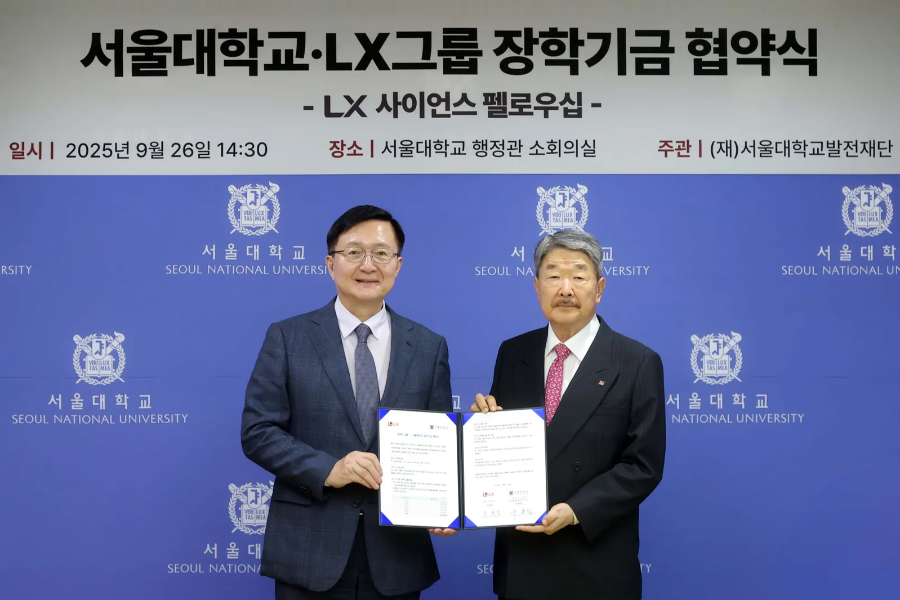서울대학교(총장 유홍림)는 2025년 9월 26일(금) 관악캠퍼스 행정관에서 서울대학교·LX그룹 ‘LX 사이언스 펠로우십’ 장학기금 협약식을 개최하였다. 유홍림 총장, 구본준 회장을 비롯해 노진서 LX홀딩스 사장, 노인호 LX홀딩스 부사장, 김주한 연구부총장, 정종호 발전재단 부이사장, 유재준 자연과학대학장, 이준환 발전재단 상임이사 등 주요 교내외 관계자들이 참석한 가운데 뜻깊은 기부를 기리며 감사의 마음을 전했다.